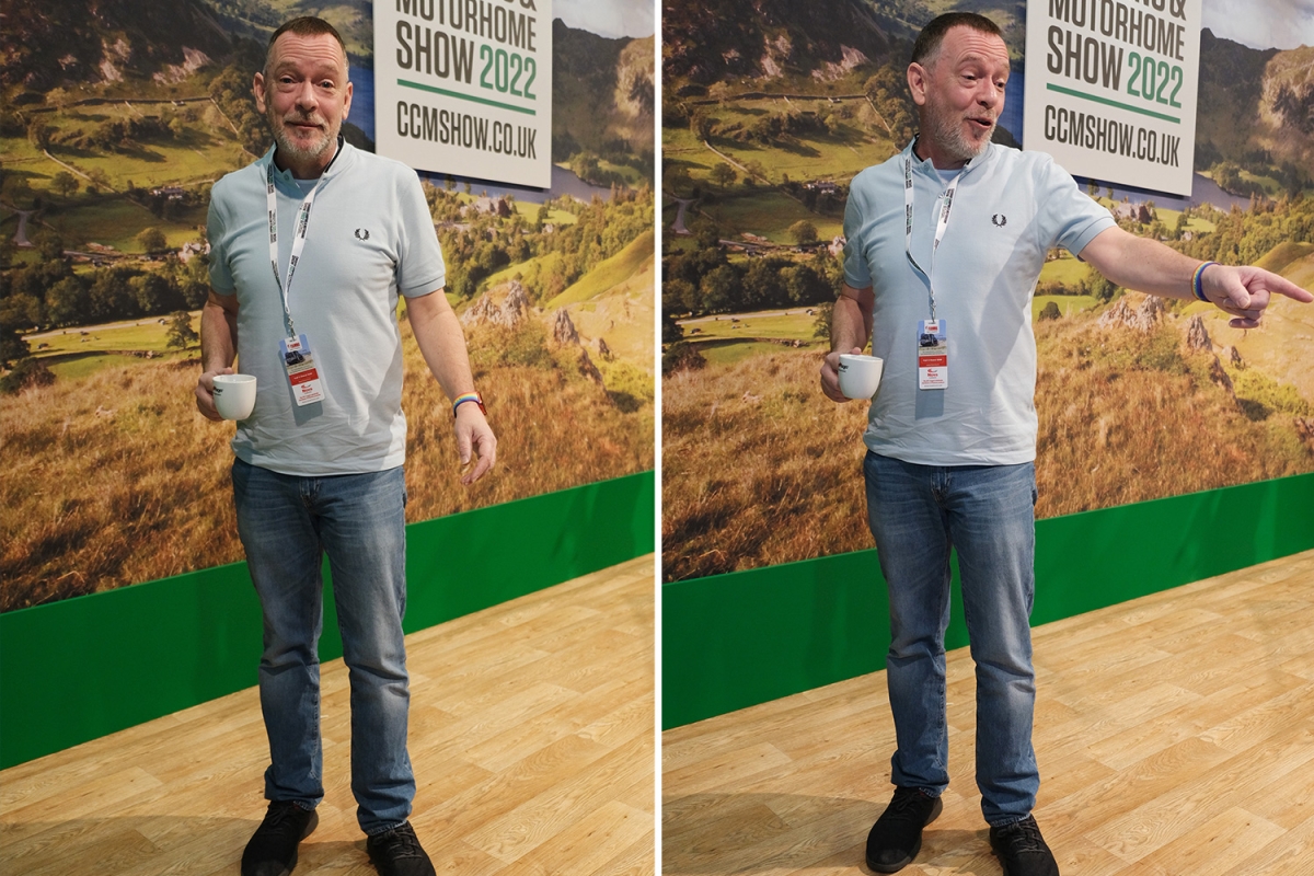 Adam, 53, wore blue jeans and a blue polo with a cup of tea at the Caravan, Camping & Motorhome Show.